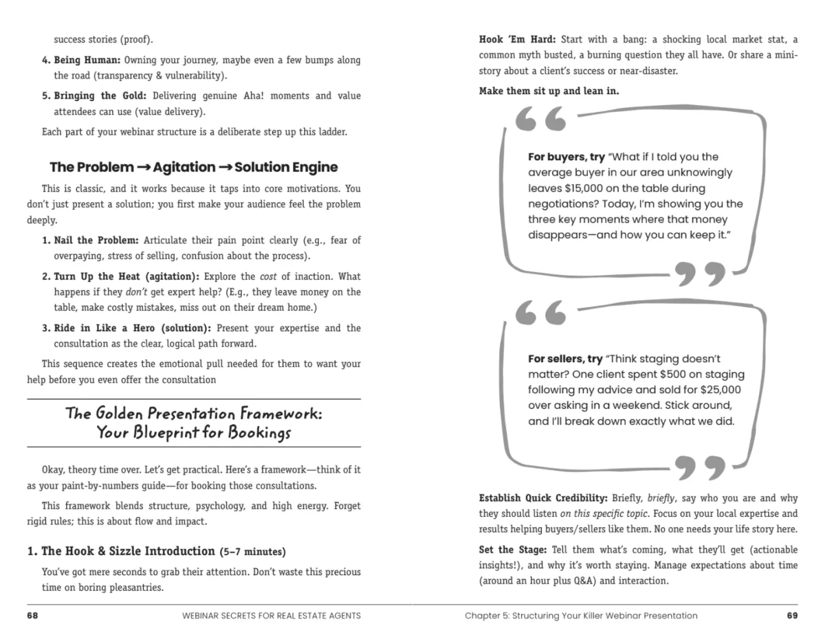Pages 32-35: The “Forbidden Five” - Five webinar topics that pull in registrations like a black hole… while your competition can’t bribe 10 people to show up. Framework #4 produced 847 sign-ups in one week—in a rural market of just 30,000.